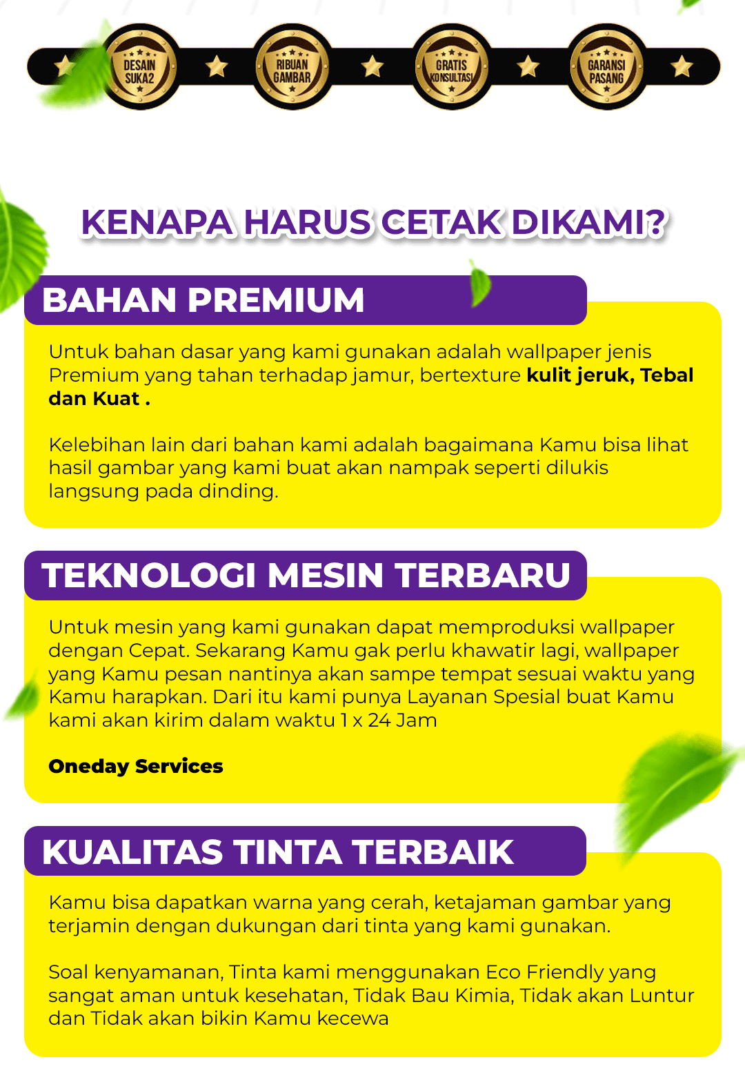 Vendor lokal di Bandung menyediakan beragam pilihan bahan berkualitas, seperti vinyl atau sticker dinding, yang mudah dipasang dan tidak merusak permukaan tembok. Cocok digunakan di berbagai jenis ruangan, mulai dari kamar tidur, ruang tamu, hingga ruang usaha seperti kafe dan butik.